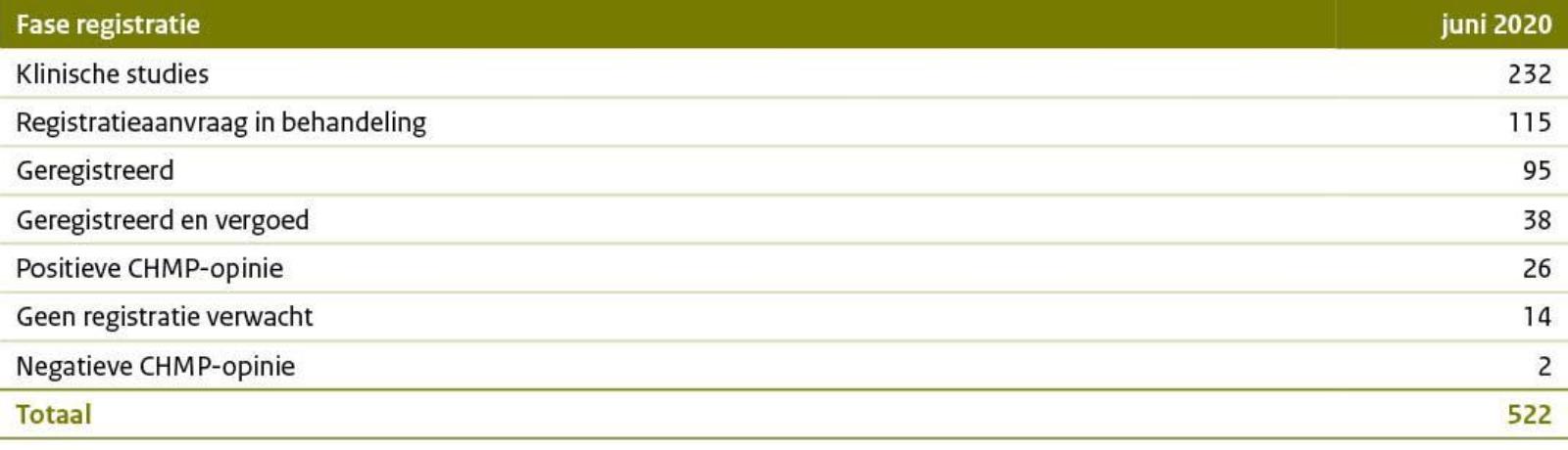 De geneesmiddelen in de Horizonscan bevinden zich in verschillende fasen van registratie of ontwikkeling. Geneesmiddelen verschijnen op de Horizonscan ongeveer vanaf fase 3 van de klinische studies en worden gevolgd tot ze zijn geregistreerd en een betaaltitel hebben in Nederland. Figuur 2 geeft een globaal overzicht van deze stadia. In totaal zijn er 522 producten opgenomen waarvan er 468 mogelijk de komende twee jaar kunnen worden toegelaten tot het basispakket. In sommige gevallen valt een geneesmiddel uit door tegenvallende studieresultaten waardoor ze ofwel door de fabrikant worden teruggetrokken of door de beoordelingscommissie (CHMP; Commission of Human Medical Products) van de EMA (European Medicines Agency) een negatieve opinie krijgen. Ongeveer 100 producten worden mogelijk het komende jaar daadwerkelijk geregistreerd.