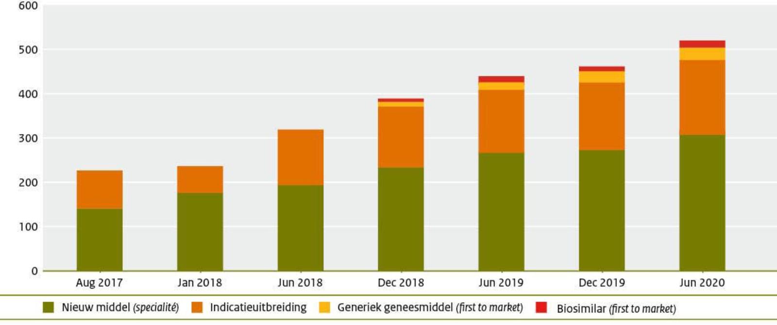 In de Horizonscan staan alle nieuw te verwachten spécialités en indicatieuitbreidingen die de komende 2 jaar op de markt komen. Verder worden sinds december 2018 ook de Biosimilars en generieken opgenomen die als eerste op er markt verwacht worden om te concurreren met het spécialité. Ongeveer 60% van de producten betreffen spécialités en ongeveer een derde zijn indicatieuitbreidingen van reeds bestaande geneesmiddelen. Het lage percentage generieken en Biosimilars komt met name omdat in de Horizonscan alleen ‘first-to-market’ producten opgenomen worden. Tweede en volgende generieken en Biosimilars worden niet meer weergegeven. In figuur 1 is ook weergegeven wat de verdeling van de verschillende producten is in de Horizonscan. In vergelijking met de vorige publicaties zijn de verhoudingen vergelijkbaar.